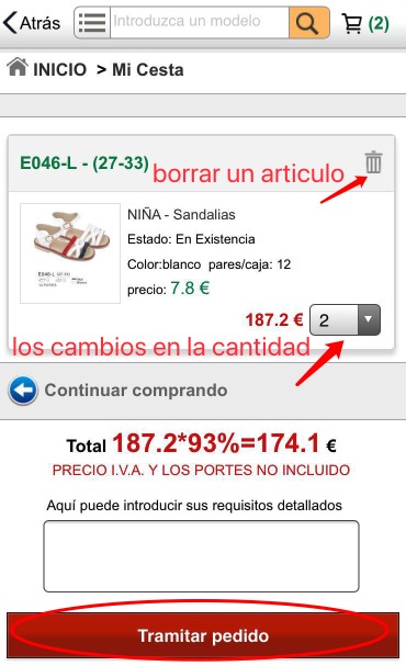 5. En cualquier momento se puede mostrar el resumen del pedido, aquí se puede además actualizar la cantidad, borrar los modelos no deseados, para continuar click "Enviar compra"